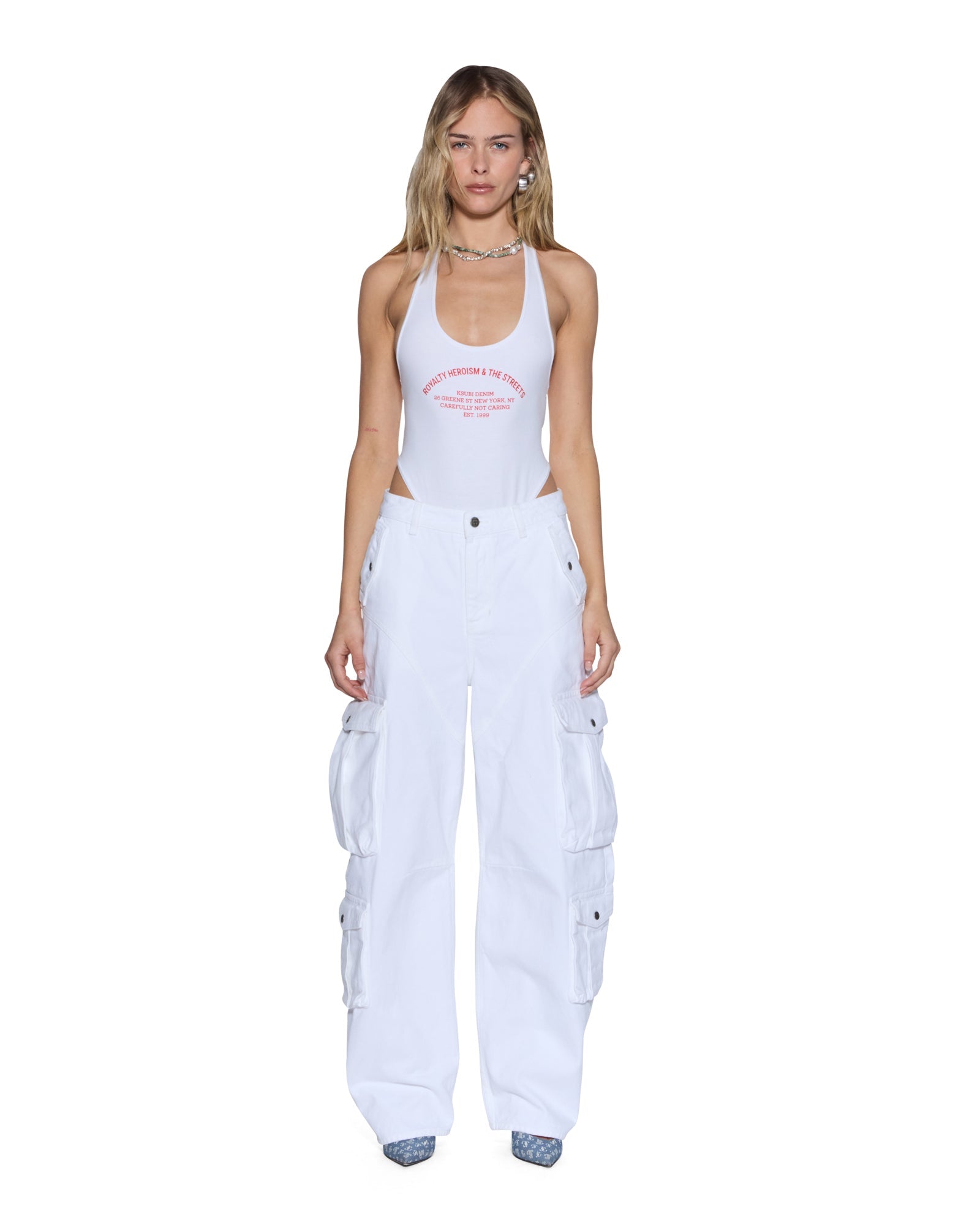 The Barrel Jean Cargo Fresh is a mid-rise, relaxed-fit jean with a distinctive barrel-shaped leg that tapers at the ankle. Made from premium European rigid denim in fresh white with tonal topstitching, it features side-facing 3D cargo pockets, curved western-inspired panel lines on the front and back thighs, Ksubi branded hardware, T-box and 3x4 embroidery, and a removable pocket tag on the wearerÕs right back pocket, designed for a flattering, sculptural silhouette. Style back with the Trucker Vest Fresh for an all-white elevated look.