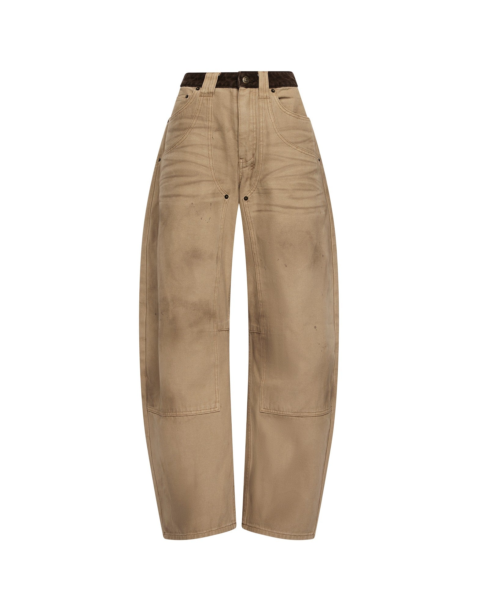 The Barrel Jean Carpenter Jean Sierra Tan is a mid-rise, relaxed fit jean with a distinctive barrel-shaped leg that tapers at the ankle. Made from heavyweight 100% cotton nailhead canvas in an overdyed tan colourway, spliced with chocolate brown denim at the waistband, it features partial grinding at the waistband, pockets and hem along with subtle oil stain splashes. Finished with classic five-pocket styling, anti-brass Ksubi branded hardware, and signature t-box and 4x4 embroidery, with a removable pocket tag at the back.