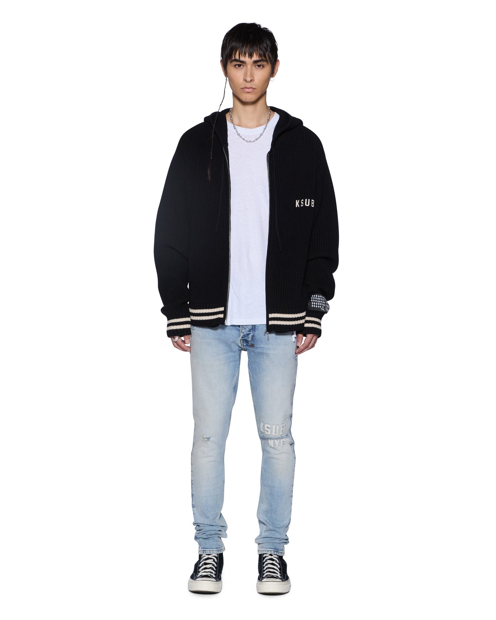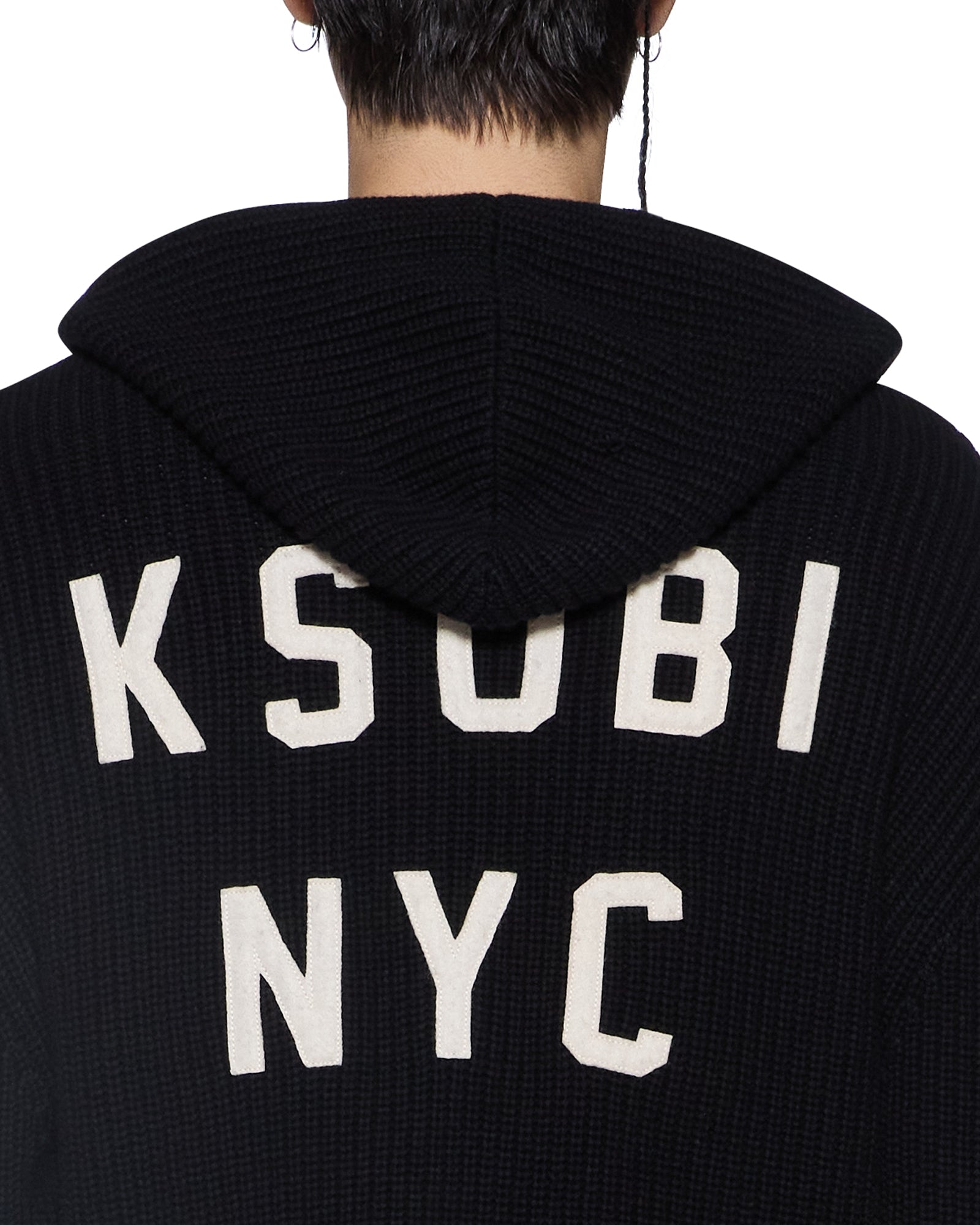 The Boxer Zip Knit Hoodie Midnight is a relaxed boxy fit hoodie with a zip-through front, drawstring hood and pouch pocket. Knitted from 100% cotton navy yarn in a heavy gauge, it features tipping stripe sleeves and seasonal felt appliqued Ksubi artwork on the front and back. Finished with signature t-box and 4x4 branding.