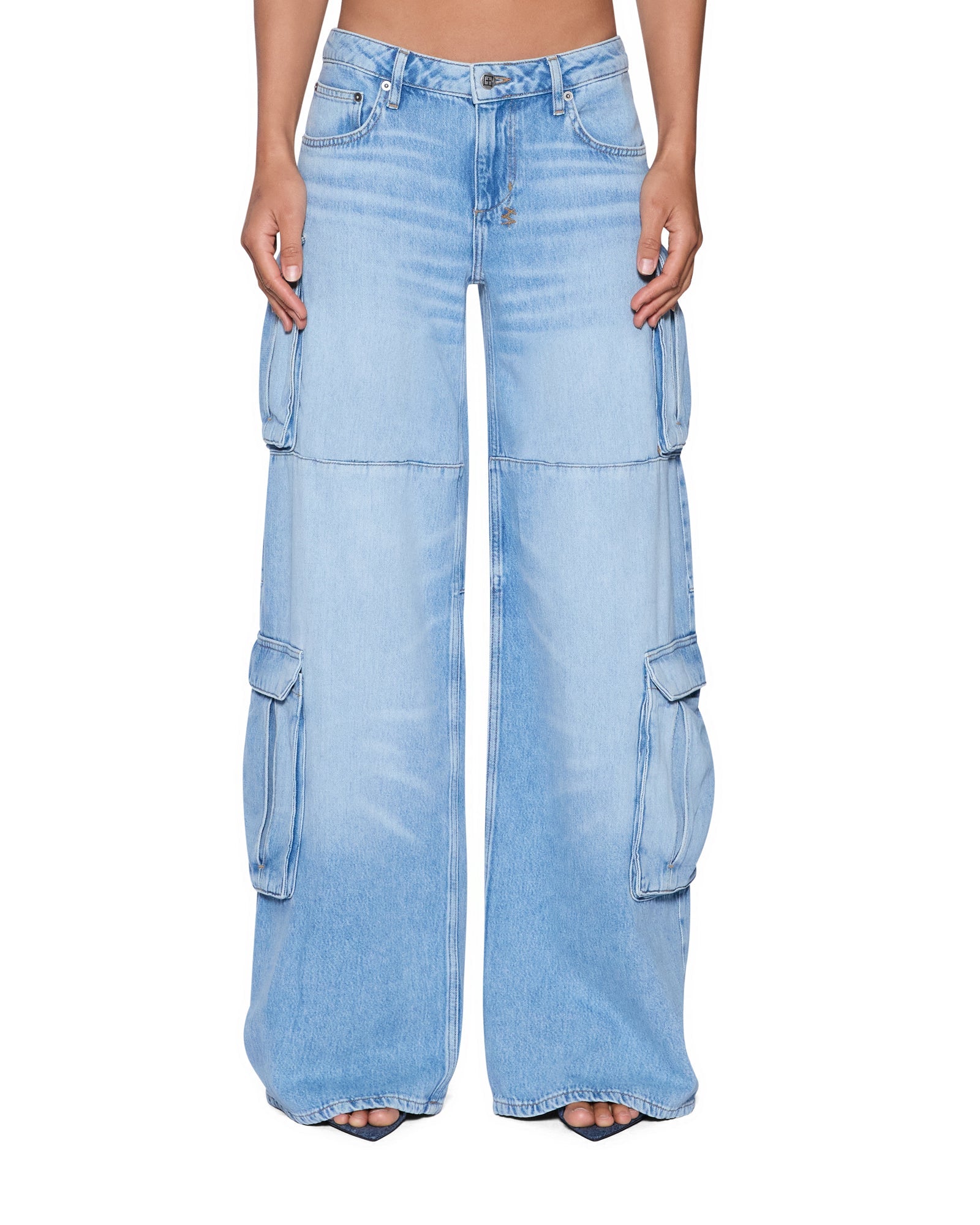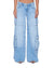 The Dropout jean Cargo Spirit is a low-rise, short-crotch silhouette with a baggy wide leg. Made from lightweight cotton tencel denim with a vintage worn-in light blue wash with extreme soft feather handfeel, with subtle grinding for an authentic worn-in finish. Featuring side facing 3D cargo pockets, complete with five-pocket styling, Ksubi hardware, signature T-box and 3x4 embroidery embroidery, and a removable pocket tag at the right back pocket.