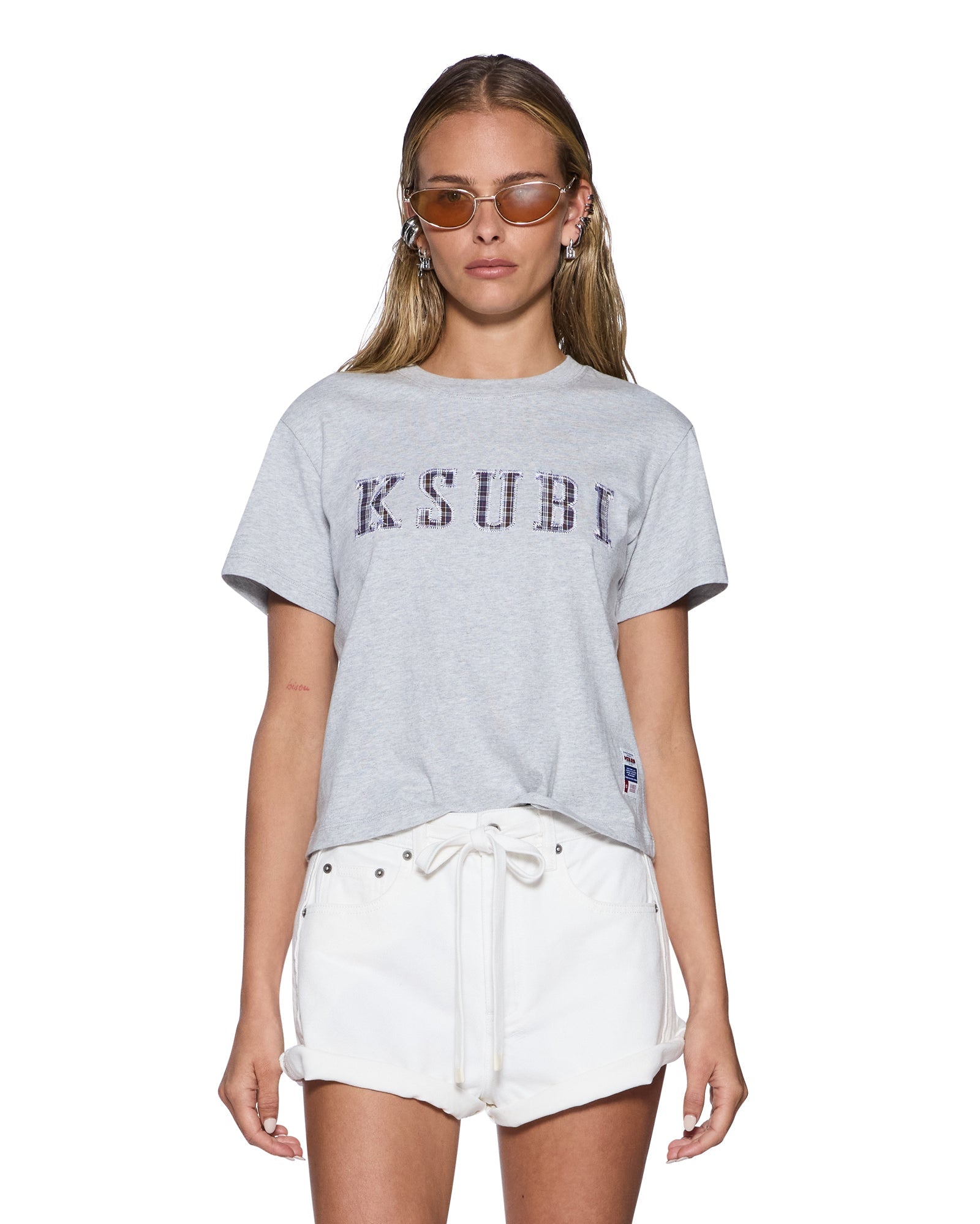 The Ksubi Plaid Shrunken Short Sleeve Tee Grey Marle is a relaxed mini tee with a crew neck, short sleeves, and regular length. Crafted from premium cotton jersey in grey marle, the style features a seasonal Ksubi plaid applique on the front and is finished with signature T-box embroidery. Style back with the Liberty Blue denim story for a complete look.