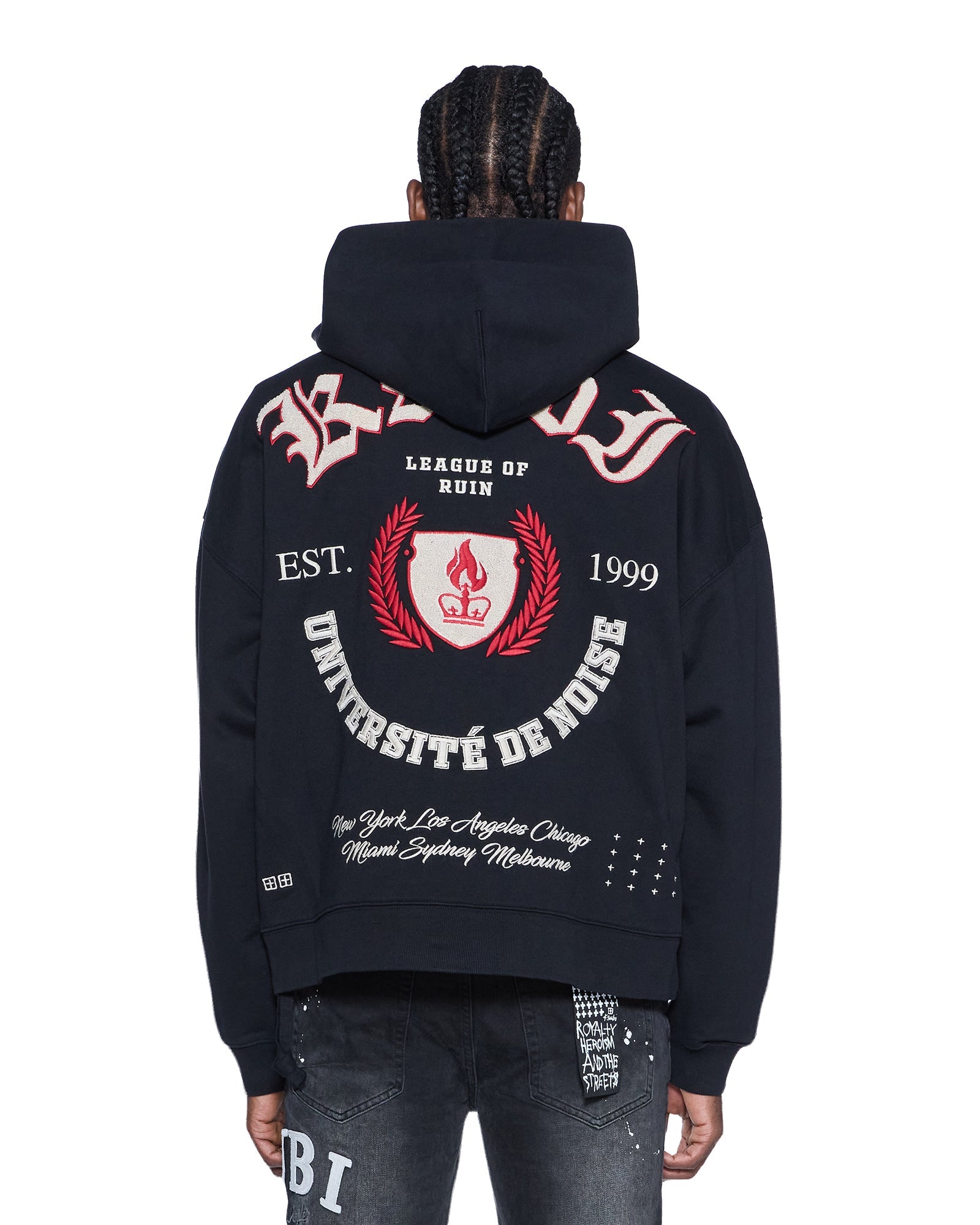 The League Ekcess Zip Hoodie Jet Black is a boxy oversized fit hoodie with a single piece hood, zip through front closure, front pouch pocket and rats tail detail. Made from loopback fleece in jet black, it features seasonal and core Ksubi badges in embroidered patches and high density embroideries all over. Finished with t-box and 4x4 embroidery branding.