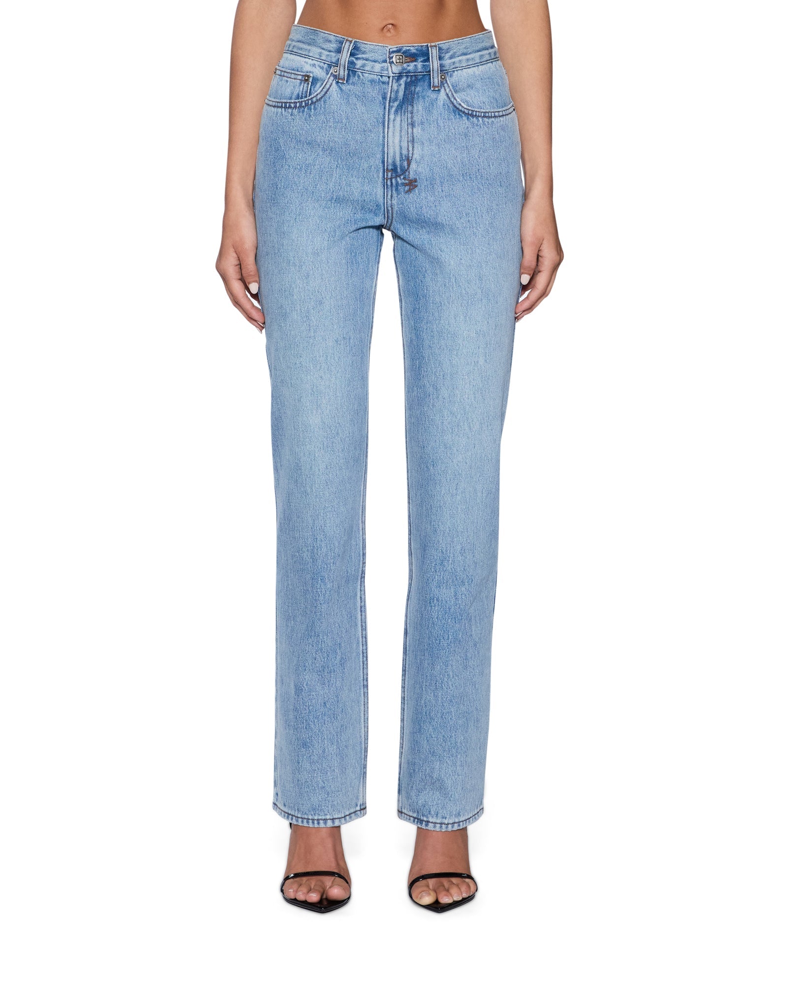 The Pin Up Straight Jean Bondi Blue is a mid-rise, slim straight, full-length silhouette designed as an everyday essential. Crafted from premium rigid denim in an authentically worn-in mid-blue wash with an ultra-soft handfeel and tobacco topstitching, the style is finished with grinding at the waistband, hem, and pocket edges for a vintage-inspired look, along with classic five-pocket styling, anti-silver Ksubi branded hardware, signature T-box and 3x4 embroidery, and a removable pocket tag.