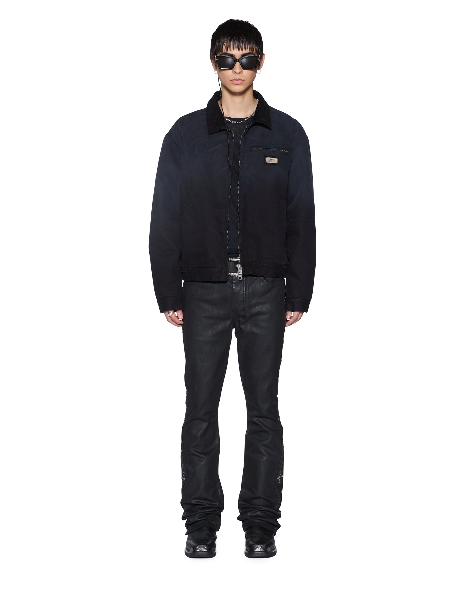 The Plated Greenwich Jacket Black is a boxy fit, regular length fully lined jacket with a zip front closure, wadded lining and a corduroy spread collar. Cut from workwear heavy nailhead canvas, and overdyed in black with ageing treatments, it has a slight spray-on vintage fade at the top of the garment. This premium jacket is constructed with front pouch pockets and a zipped welt chest pocket, and also features a leather backed Ksubi metal plate at the chest and is finished with signature t-box and 4x4 embroidery.