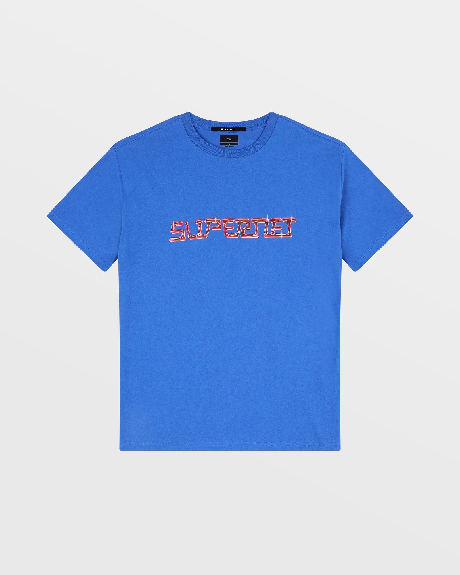 The Supernet Biggie Ss Tee Cobalt is an oversized fit, short sleeve t-shirt featuring digitally printed artwork on the front and extra large contrast 4x4 cross print on the back. This style is constructed from premium cotton jersey in our custom cobalt blue colourway and treated with an aged wash. Designed with a raw-cut back hem, reverse overlocked side seam and rats tail detail.